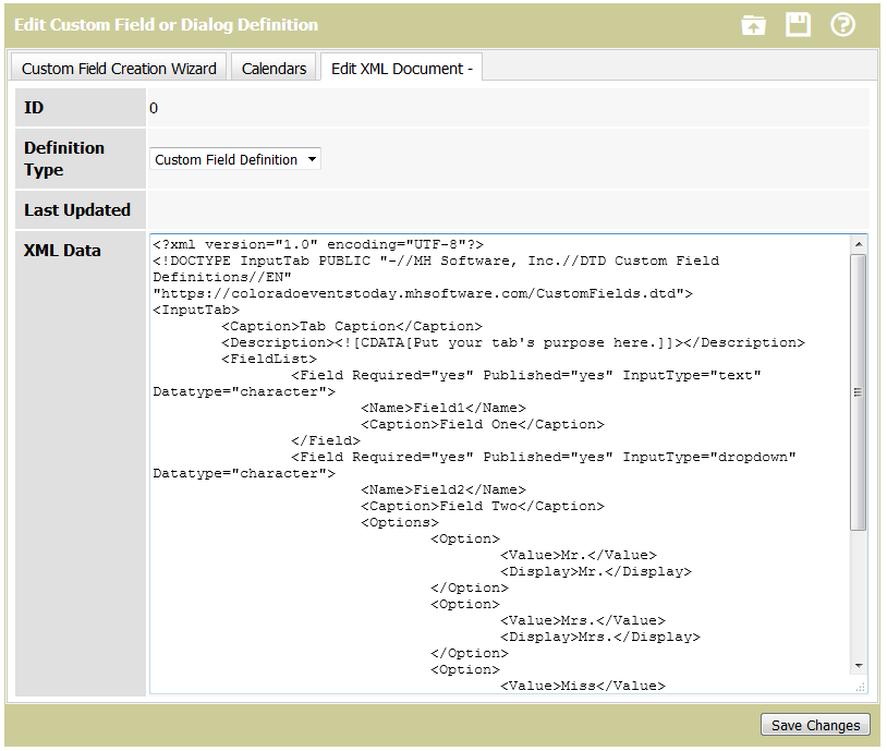Once you have created the custom input tab, you must edit your calendar's definition to include the new custom tab.